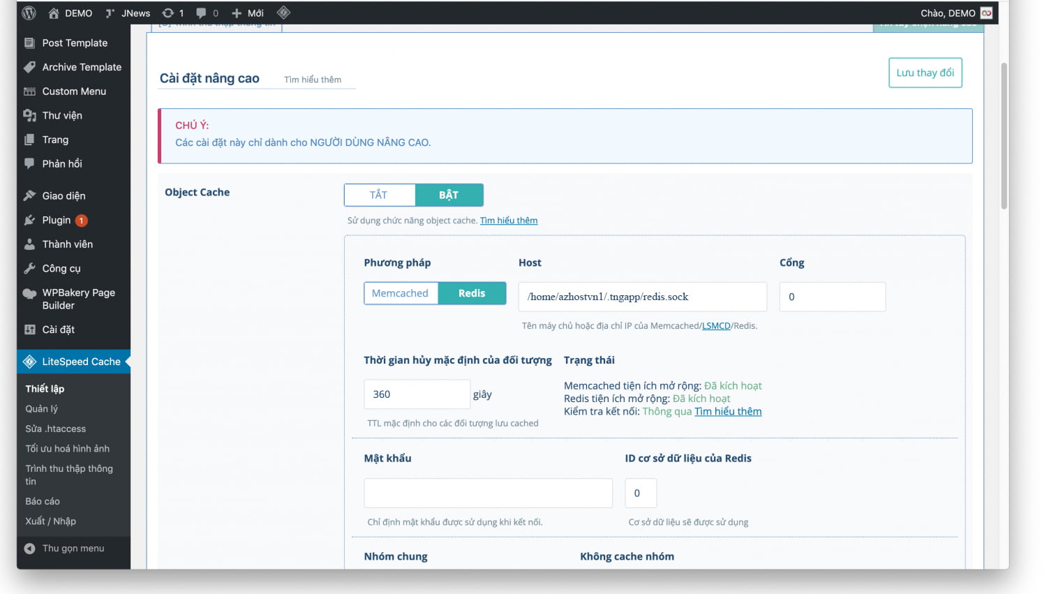 Coppy Unix Socket tại phần Cached Plugin đưa vào phần Host trong cài đặt nâng cao => Object Cache trên LiteSpeed Cache plugin.