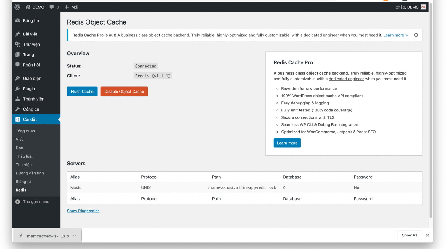 Hướng dẫn cài đặt Cài đặt Redis Cache với Redis Object Cached plugin :