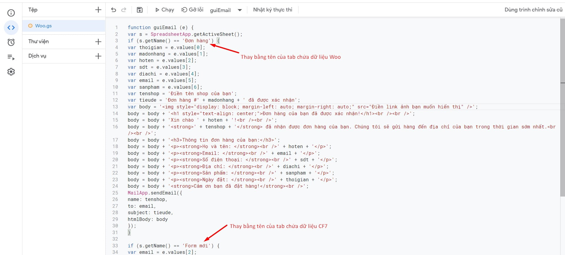 Nhớ thay đổi các thông tin trong code nhé, xong ấn lưu lại