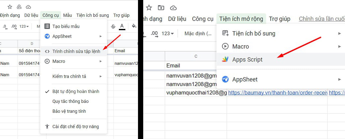 Ở file sheet các bạn vào Công cụ -> Trình chỉnh sửa tập lệnh, nếu ko thấy thì có thể vào Tiện ích mở rộng -> App Script
