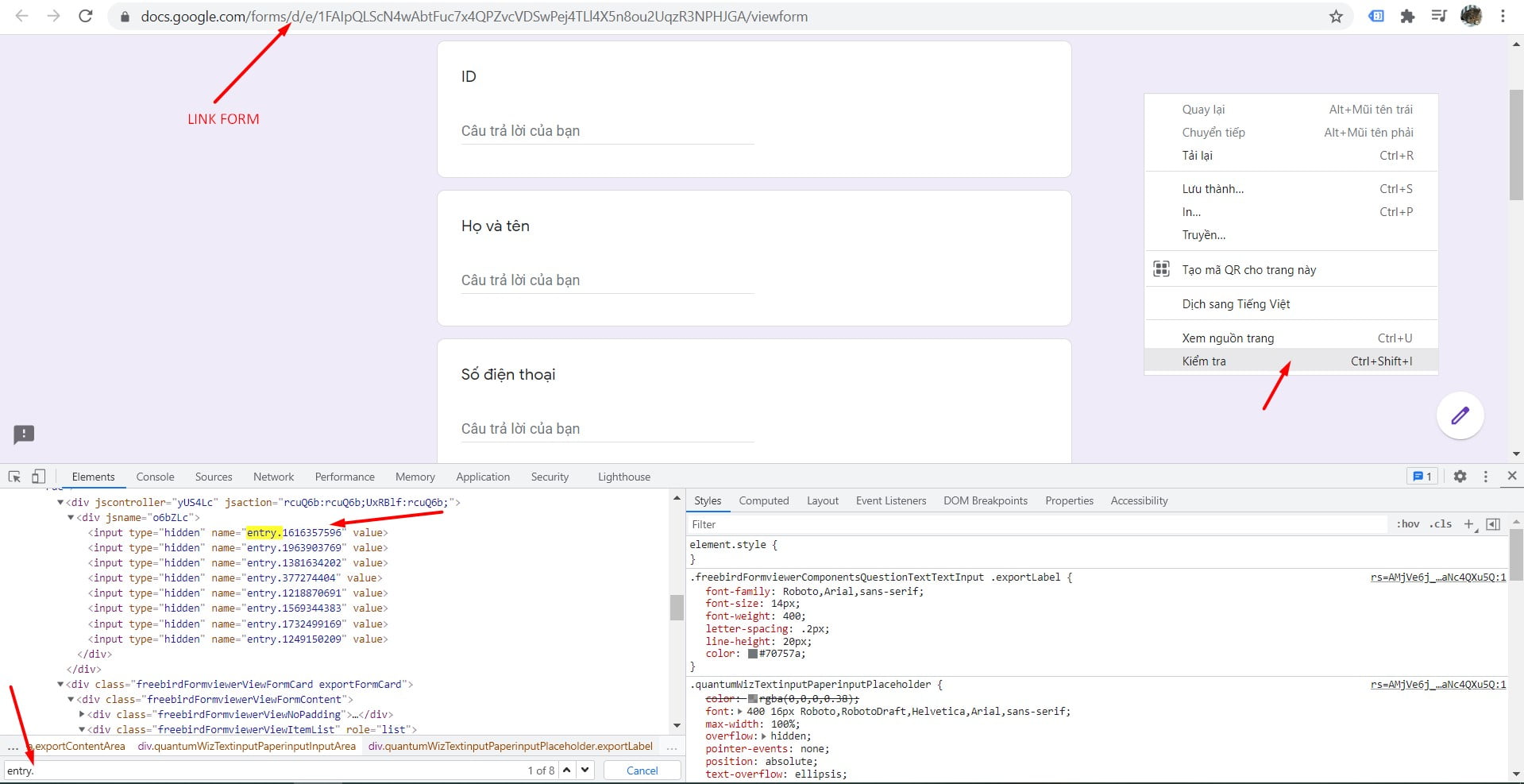 Tạo xong ấn vào hình con mắt để lấy link form và các entry, ấn chuột phải chọn “Kiểm tra” hoặc ấn F12 để vào Dev Tools, tại đây các bạn ấn ctrl + F để tìm kiếm từ khoá “entry.” (entry có dấu chấm nhé)
