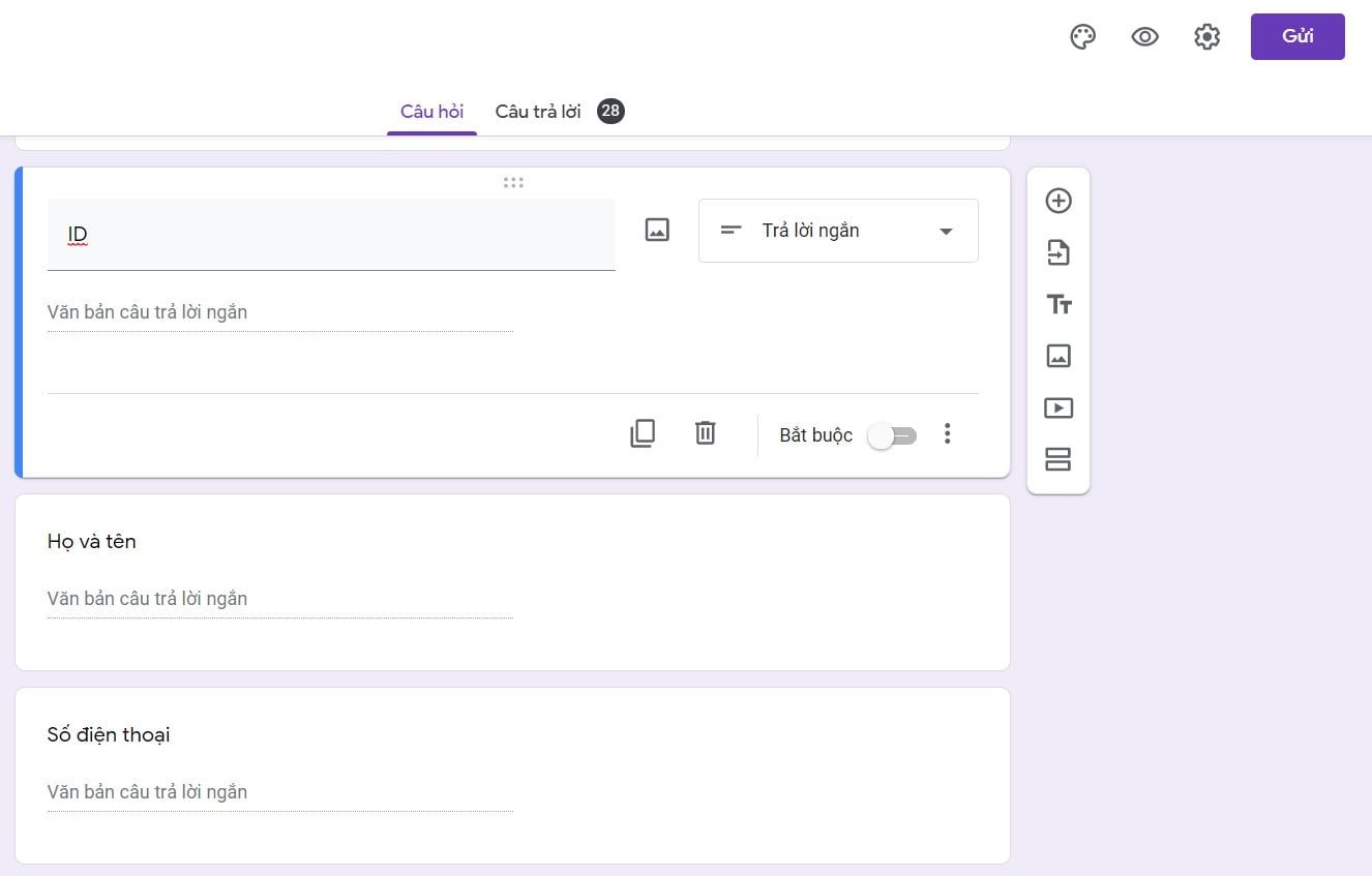 - Tạo Google Form với câu hỏi là các dữ liệu cần lấy về như ID đơn hàng, Họ tên, Số điện thoại…