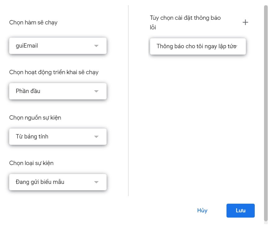 Tiếp theo đó chúng ta cần tạo trình kích hoạt cho cái hàm này, để khi mà sheet nhận được thông tin thì hàm này nó sẽ chạy :
