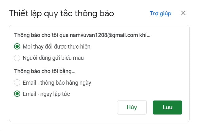 Tại Google Sheet bạn chọn Công cụ -> Quy tắc thông báo -> Thêm quy tắc thông báo. Chọn như hình :