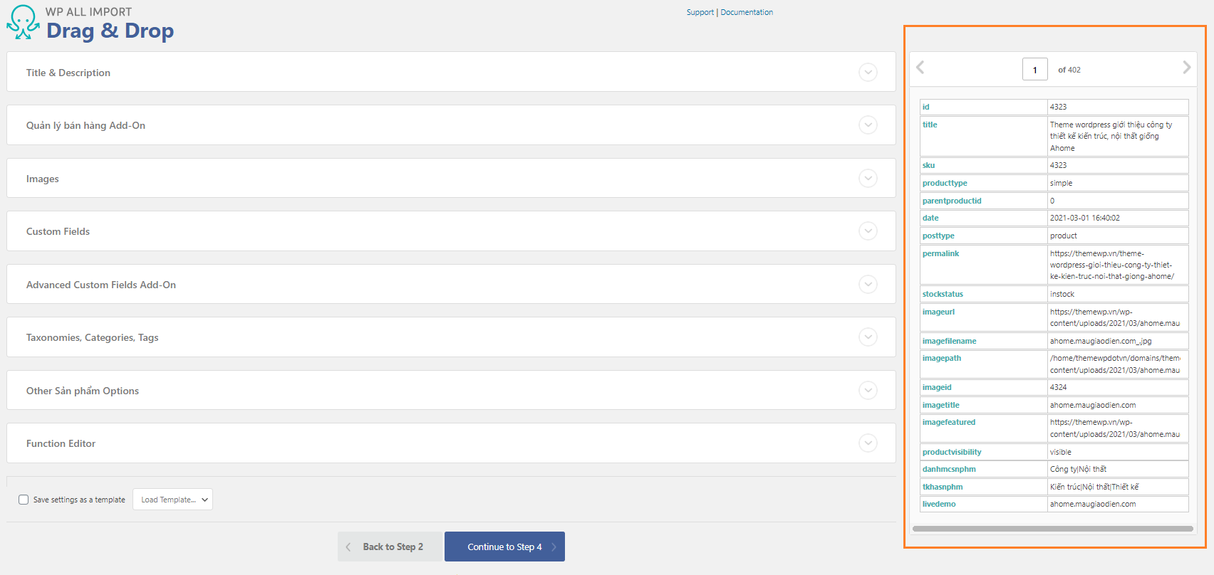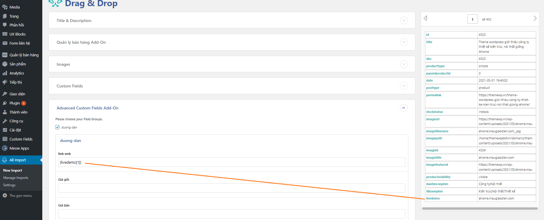 Ví dụ này Themewp.vn sẽ hướng dẫn bạn nhập dữ liệu đã được export ra từ wocoommer bằng WP All Export Pro gồm thêm trường tùy chỉnh Advanced Custom Fields, cụ thể ở đây là import file demo theme dùng để cập nhật giao diện demo dành cho các đơn vị thiết kế website.