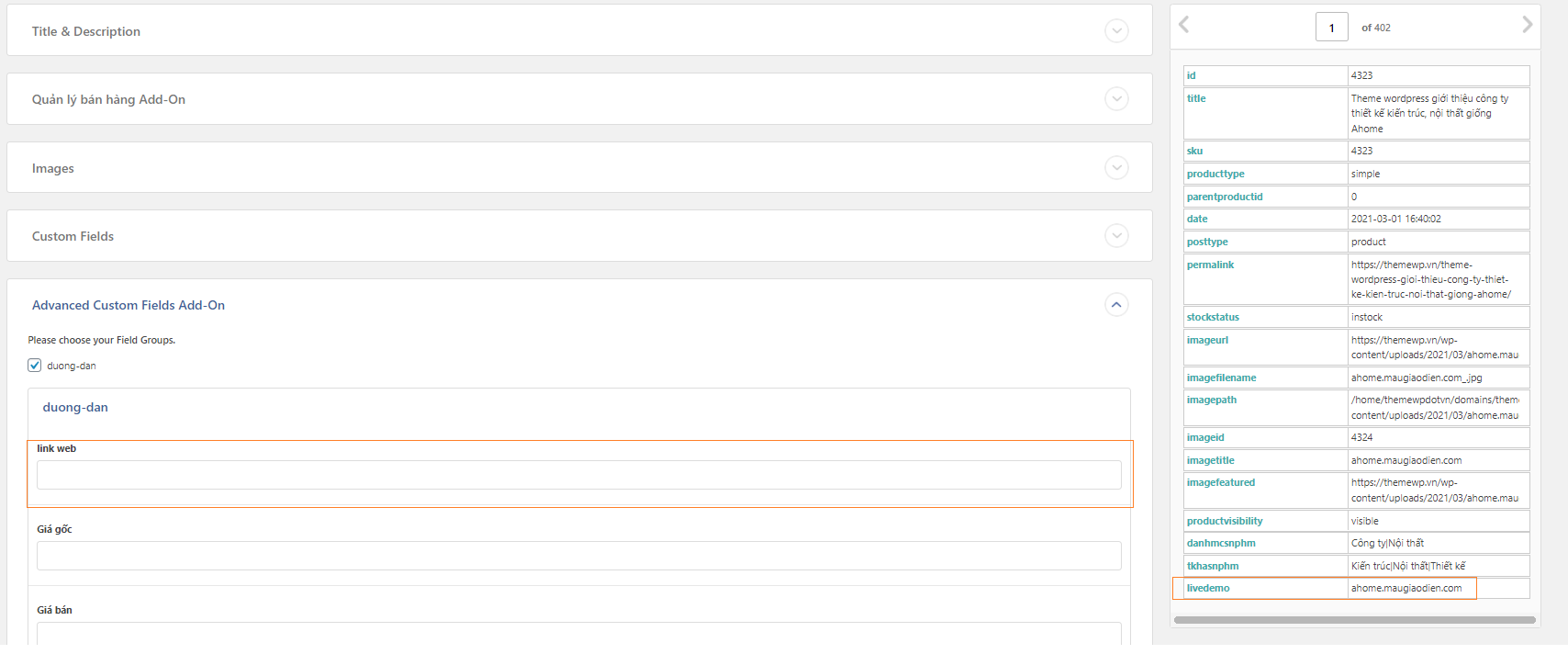 Bằng cách click vào phần Advanced Custom Fields Add – On chọn đường dẫn, tức là Theme ở ví dụ này được thiết kế dùng thêm ACF để tạo trường tùy chỉnh là link web để hiển thị link demo