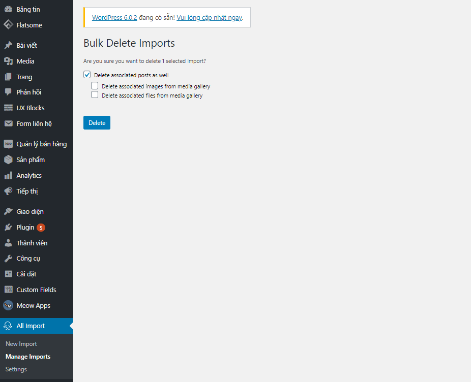 Chú ý: Nếu bạn xóa phần này các sản phẩm, dữ liệu import vào cũng bị xóa sạch