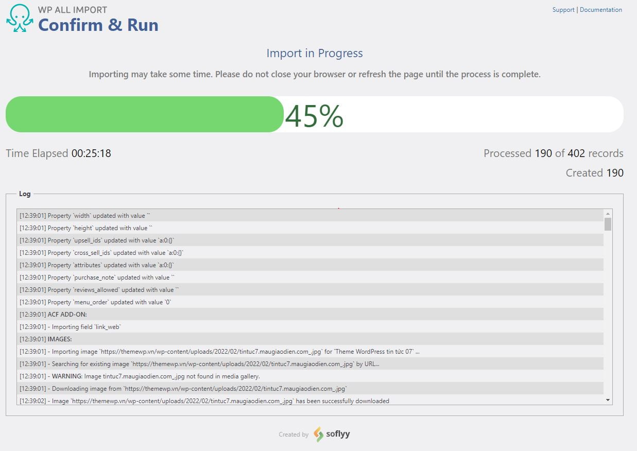 Sau khi quá trình import hoàn thành sẽ hiển thị thông báo cho mình. Như ví dụ này import 402 sản phẩm test trên web demo mất thời gian khoảng 30 phút cũng khá nhanh.