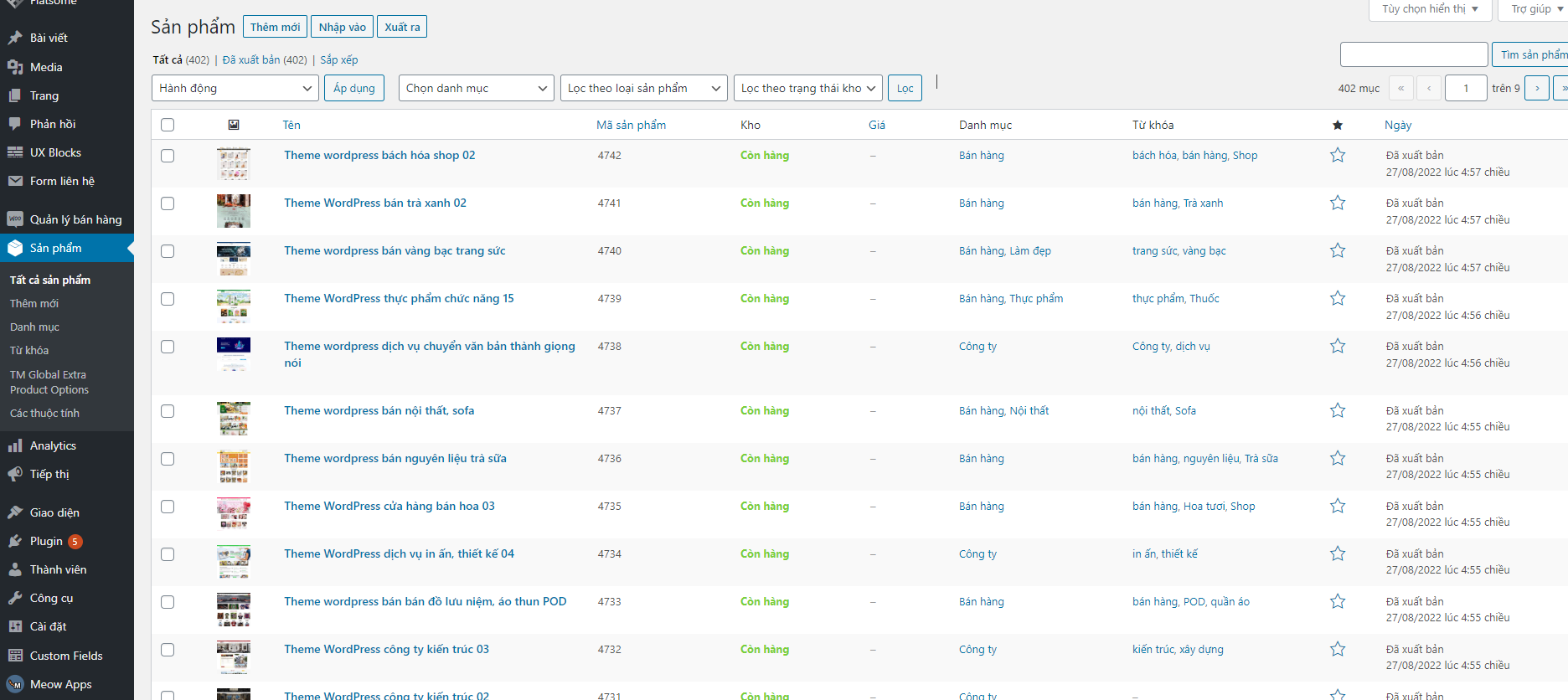 - Hình ảnh, danh mục, WooCommerce, ACF, v.v.