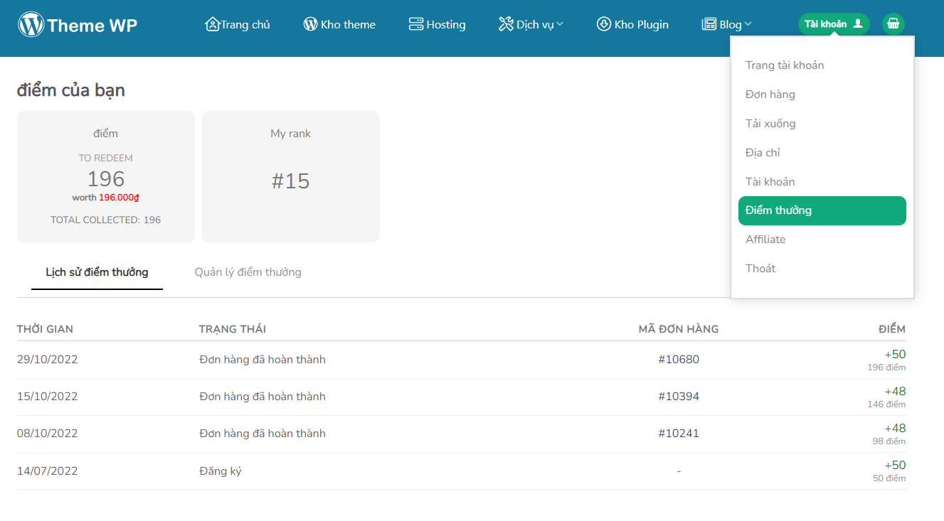 Sau khi nạp tiền tài khoản bạn có được một số lượng điểm thưởng, khi mua theme vào phần thanh toán, bạn sẽ thấy thông báo cách hình thức thanh toán, bạn sử dụng hình thức bằng sử dụng điểm để hoàn tất đơn hàng.