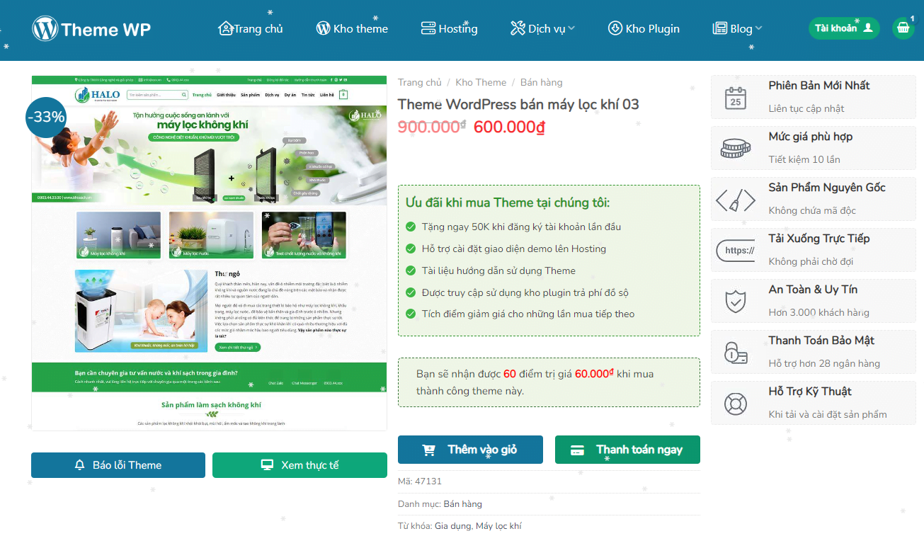 Mua Theme: Sau mỗi lần mua Themes, bạn sẽ được tích lũy một số điểm thưởng nhất định, số điểm thưởng này được hiển thị tại trang chi tiết của Themes, bạn có thể xem hình bên dưới: