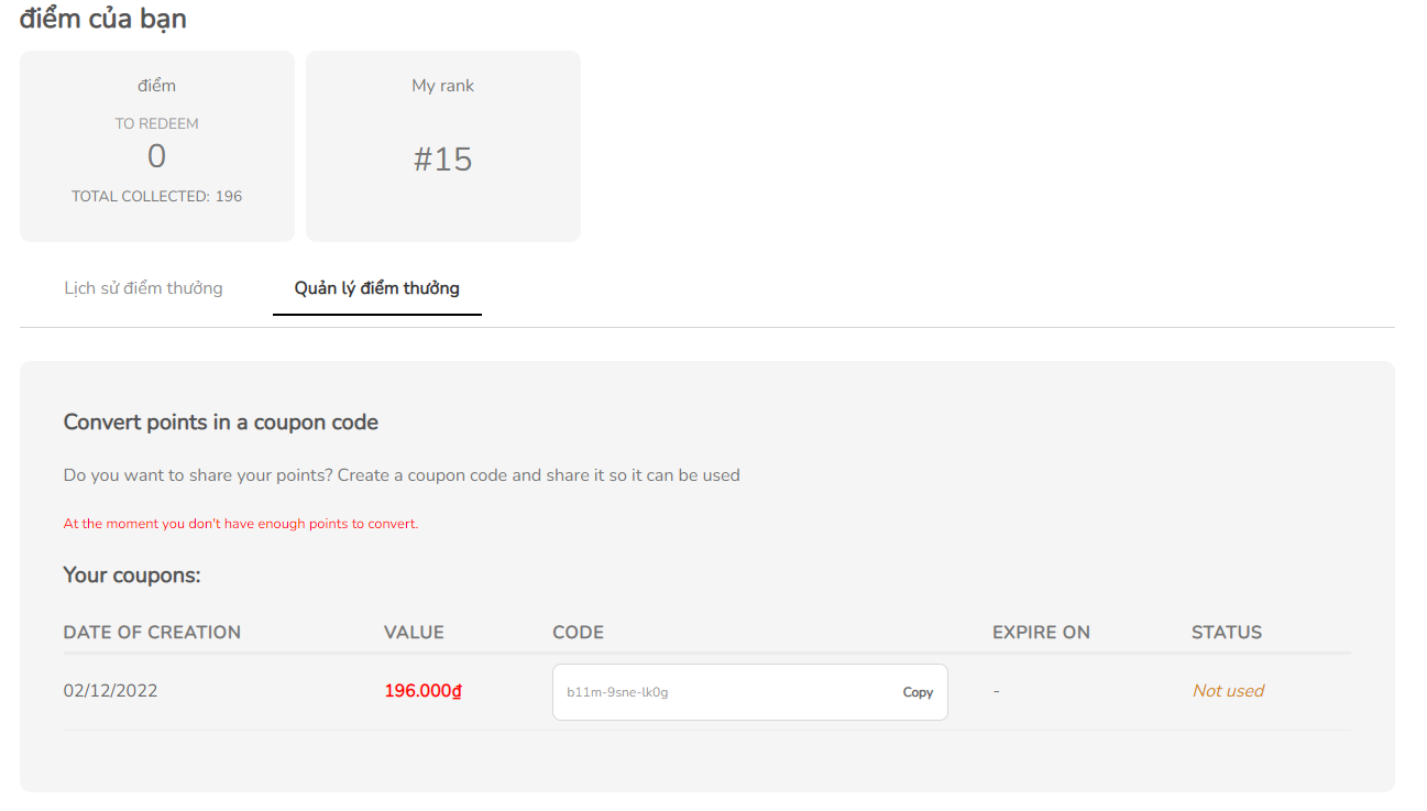 Ngoài ra tại mục “Quản lý điểm thưởng” bạn có thể chuyển đổi số điểm thưởng của bạn thành mã giảm giá, để có thể sử dụng hoặc chia sẽ cho bạn bè.
