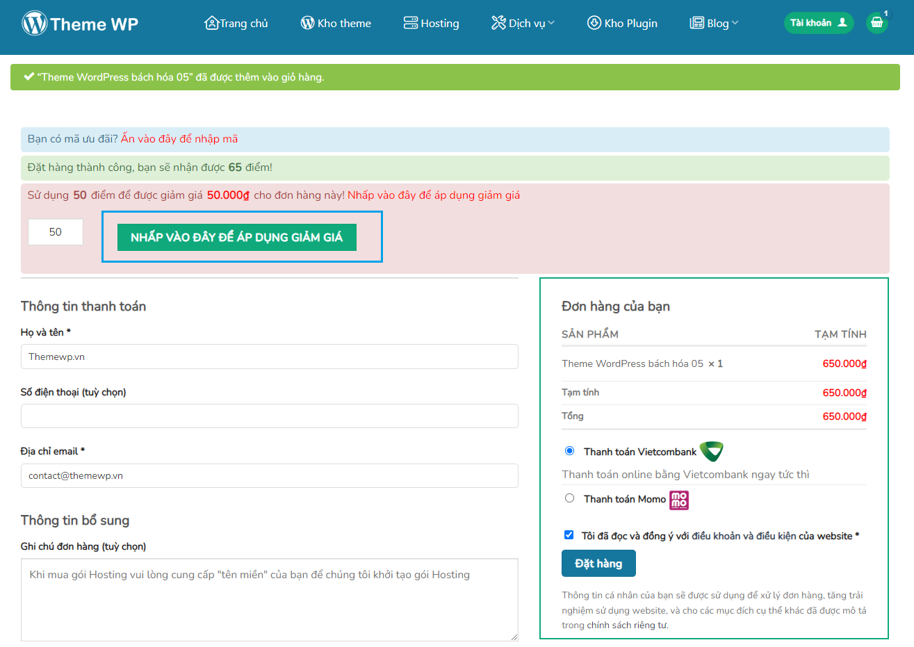 Khi tài khoản bạn có được một số lượng điểm thưởng, thì ở lần mua themes tiếp theo, khi vào phần thanh toán, bạn sẽ thấy thông báo như sau: