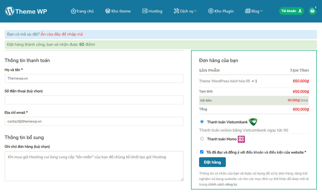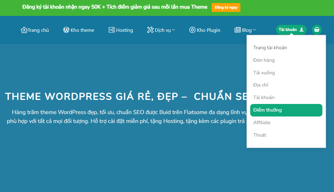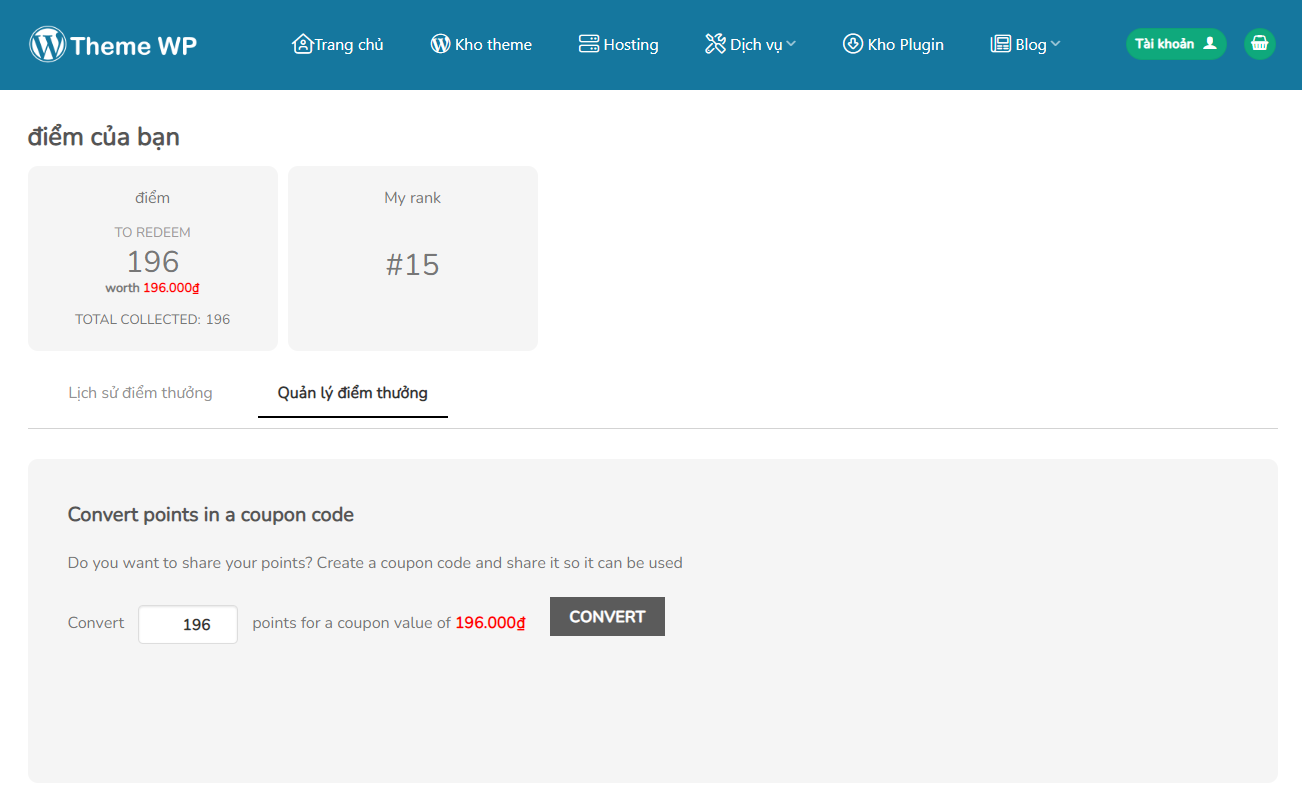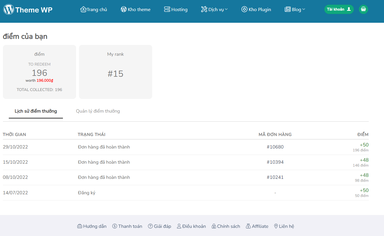 Sau khi bạn đăng ký tài khoản mới tại Themewp.vn, và đặt mua Theme, bạn sẽ được tích lũy một số điểm thưởng nhất định.