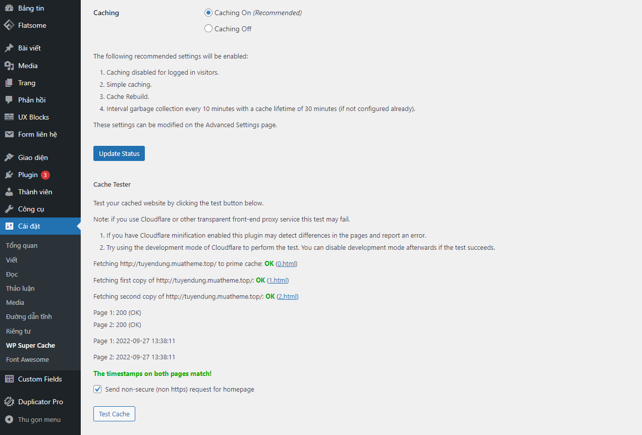 Click vào “update status” để kiểm tra trang thái tiếp theo bạn click vào “Test Cache” nếu hiển thị OK như hình là Plugin đã hoạt động