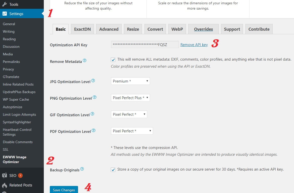 Sau khi cài đặt kích hoạt Plugin vào mục Settings để kích hoạt key miễn phí sau đó đi đến phần EWWW Image Optimizer. Thêm key miễn phí và chọn lưu lại.